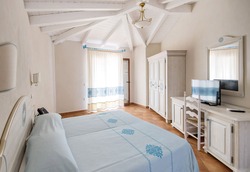 DESCRIZIONE E SERVIZI: Il Resort dispone di 134 camere, tutte arredate in tipico stile sardo, suddivise tra camere Doppie, Triple, Quadruple (con letto a castello) e bilocali Family Room, tutte con patio o veranda, dislocate in diverse corti a due piani (terra e primo) circondate da giardini fioriti. Camere Doppie: con due letti singoli o un letto matrimoniale. Camere Triple: con tre letti singoli o un letto matrimoniale + un letto singolo aggiunto. Camere Quadruple: con un letto matrimoniale + un letto a castello aggiunto. Bilocali Family Room doppio ambiente, unico servizio, con camera matrimoniale + camera con 2 letti singoli. Le camere sono tutte indistintamente dotate di patio o veranda attrezzati con tavolino, sedie, posacenere e stendi biancheria, servizi privati con doccia, asciugacapelli, set cortesia, aria condizionata, telefono, cassetta di sicurezza elettronica, minibar (consumazioni a pagamento) e TV LCD. |